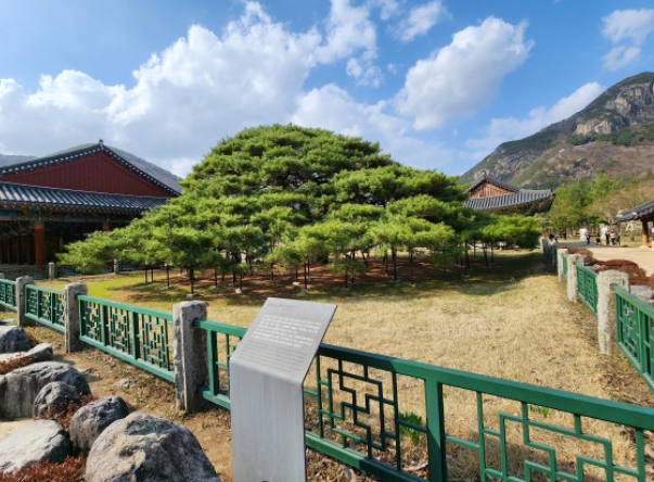 주변의 인공적인 압력 없이도 늘어져서 넓게 자라는 나무로 유명합니다. 수령 500년에 이르는 이 소나무는 어느 선사가 이곳을 지나다가 시들어진 나뭇가지를 꽂아둔 것이 뿌리를 내렸다고 전해지고 있습니다. 해마다 음력 3월 3일인 삼짇날 막걸리 12말을 희석하여 영양제로 부어준다고합니다.
